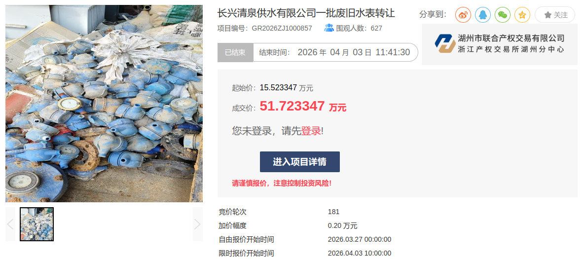 近日,湖州产权携手长兴两山公司完成长兴清泉供水有限公司一批废旧水表转让项目。该项目以51.72万元顺利成交,溢价率高达233.20 %。